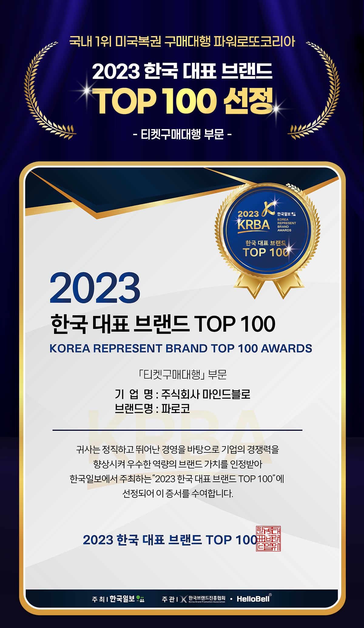 미국복권 구매대행 서비스인 ㈜마인드블로의 파로코(파워로또코리아)가 한국일보 주최 ‘2023 한국 대표브랜드 TOP100’ 시상식에서 ‘티켓구매대행’ 부문 대상을 수상했다.