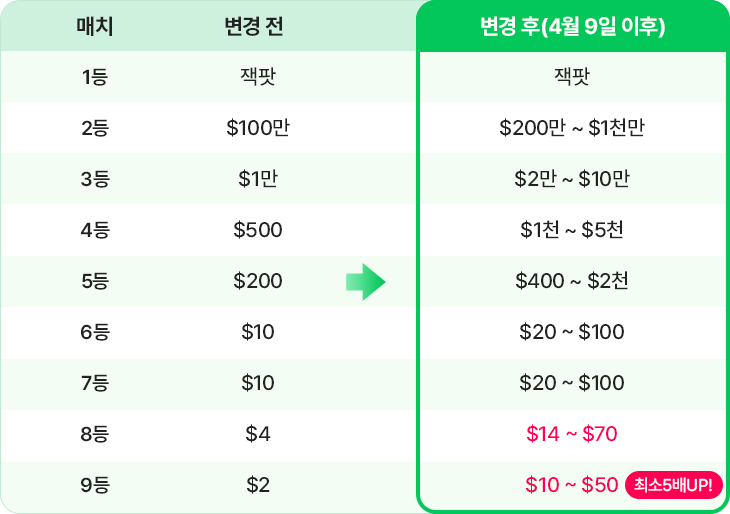 ▶ 최소 당첨금 상향: 전체 등위의 최소 당첨금이 미화 10달러에서 최대 1천만 달러로 상향 조정됩니다.