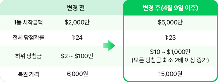 ▶ 복권 가격 인상: 복권 구매 가격은 기존 6,000원에서 15,000원(부가세 별도)으로 인상됩니다.